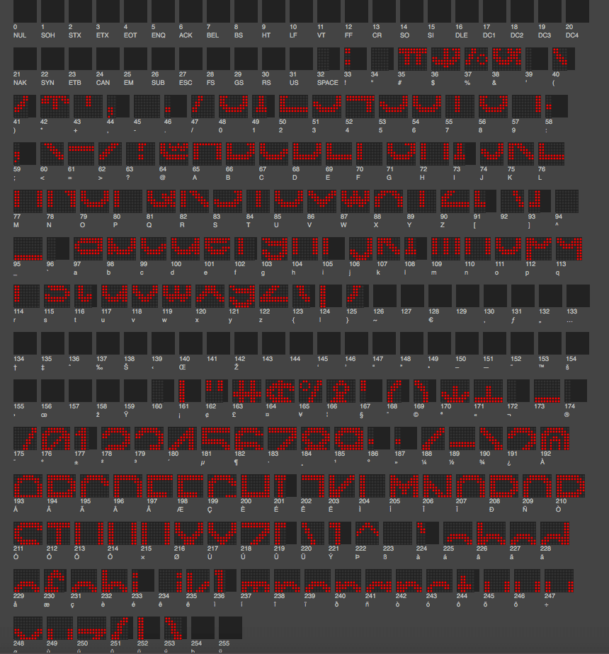 Dans les illustrations ci dessous , les définitions des caractères répartis sur les 255 codes Ascii , de 0 à 127 la moitié basse et de 128 à 255 la moitié haute . Ainsi que le visuel de ce que l’on obtient une fois les deux définitions réunis.