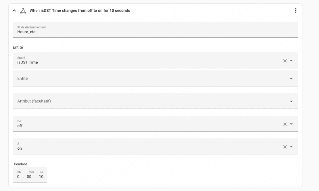 Création de la nouvelle automatisation , pour les déclencheurs , je choisi un déclenchement sur état . Heure été quand is_dst passe de OFF a ON et heure hiver quand is_dst passe de On à OFF
