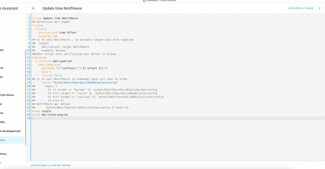 Je crée un script , afin d’avoir un service a appeler pour modifier l’heure, dans le menu paramètre -> automatisation et scene -> script .