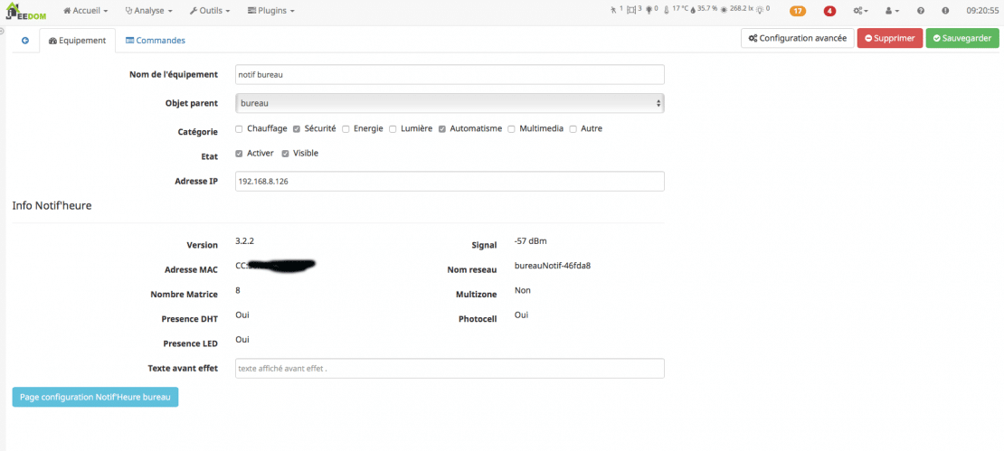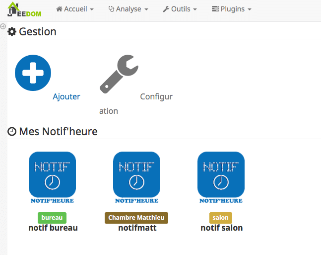 Dans la page de configuration de l’objet , il sera possible de modifier certaines options et il y a un lien vers la page de configuration du notif’heure , pour les autres réglages.
